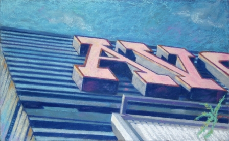 A recent series of pastel works by Clarence Porter explores the opposite effect to Elia, the individual feature of a building or object that captures our experience of place. Porter, who lives in the Ottawa Street North area, depicts a number of local business signs from angles that you might see if you stood on the sidewalk and looked straight up. While revealing only a portion of a sign or object, the visitor who is familiar with the street would immediately recognize the building or location. Since many of these signs are from times long past, his work also captures memory as place.