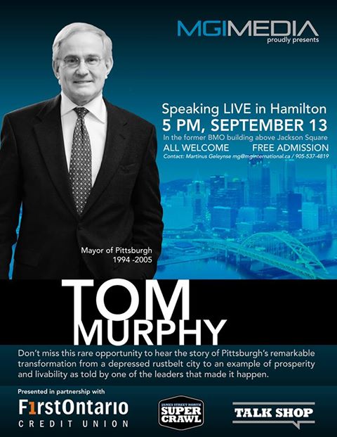 Tom Murphy, Mayor of Pittsburgh from 1994 to 2005. He is speaking today at 5 pm (Sept 13th) in the former BMO building above Jackson Square.