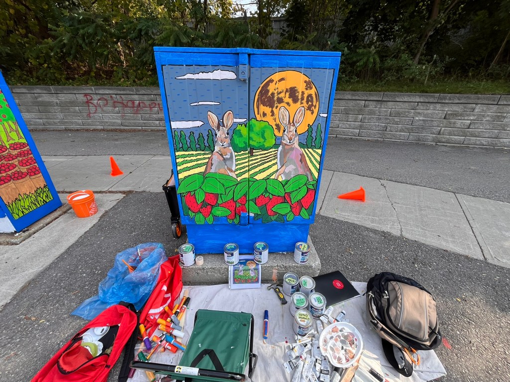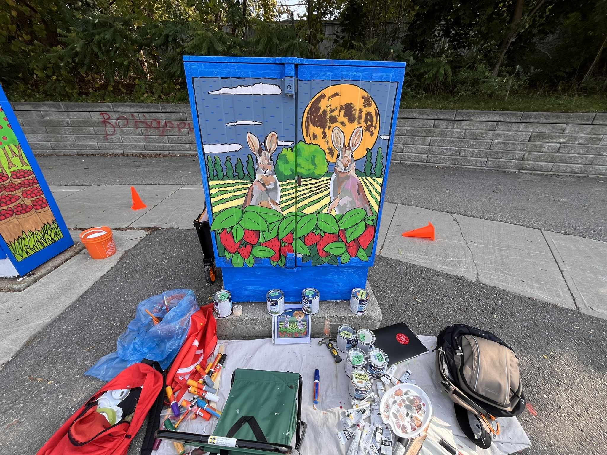 To celebrate this celestial event, I created “Rabbits Under Full Moon.” This mural is one of ten unique panels I am painting for the Clarkson BIA and Mississauga Arts Council. The project celebrates Clarkson’s agricultural past and local wildlife.
